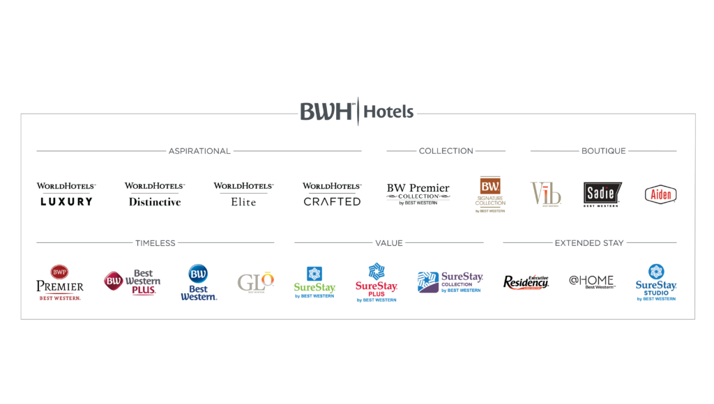 BWH Hotels es un líder global con una red de más de 4,300 hoteles en más de 100 países y territorios en todo el mundo, que abarca 18 marcas a nivel mundial en cada segmento de la cadena hotelera.
